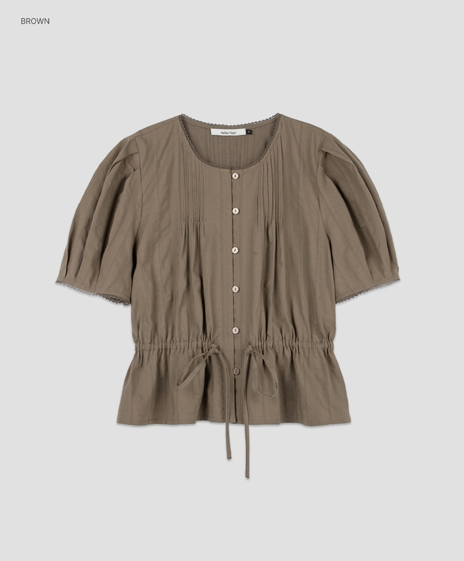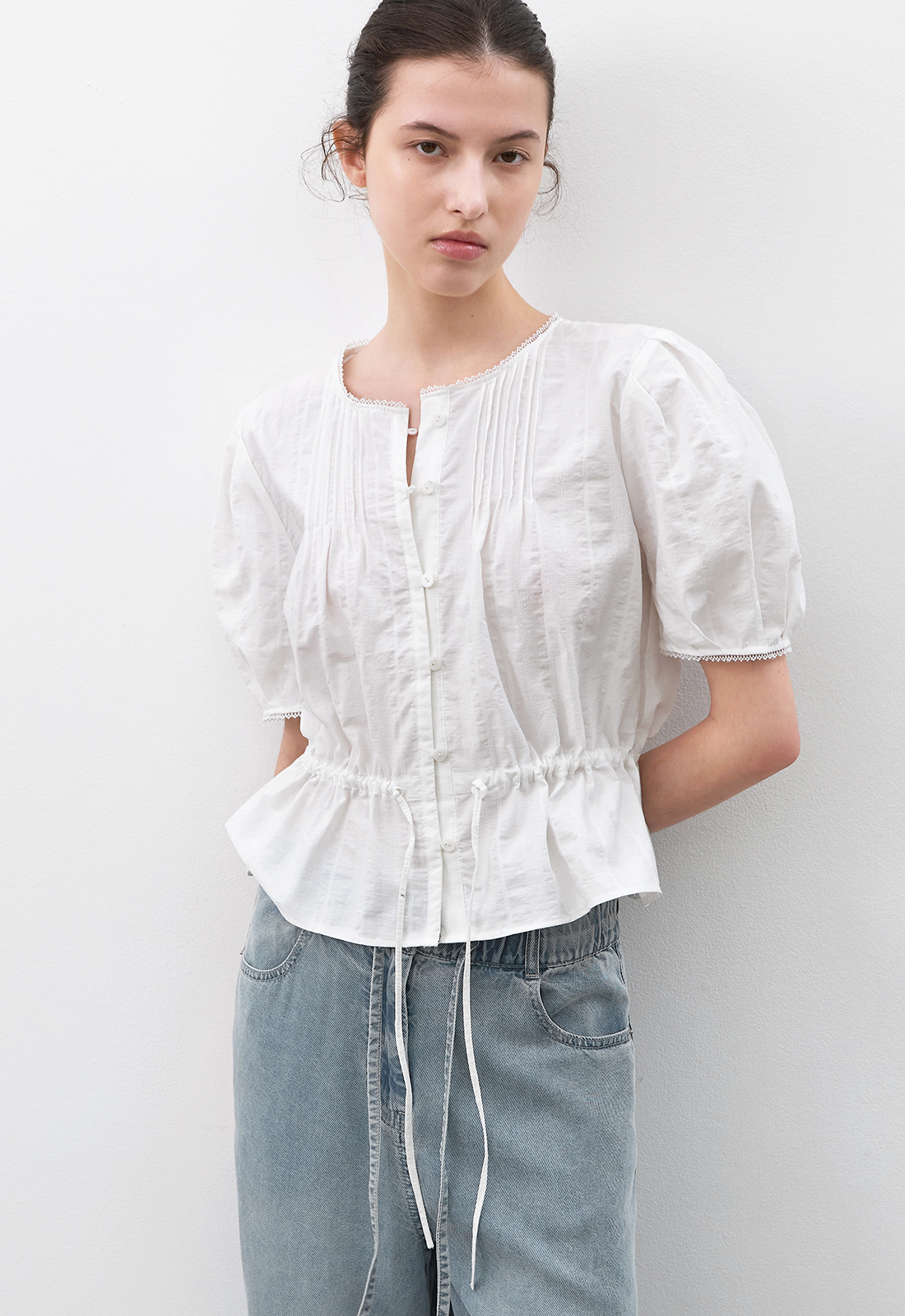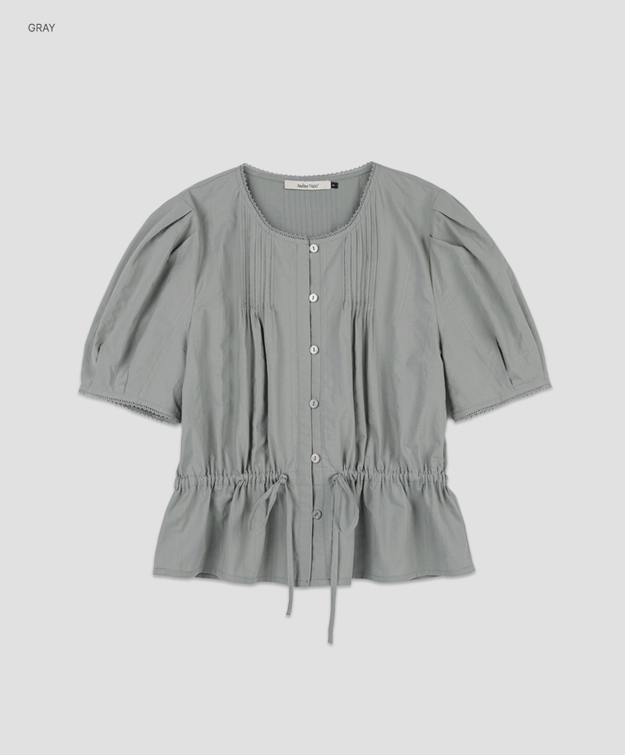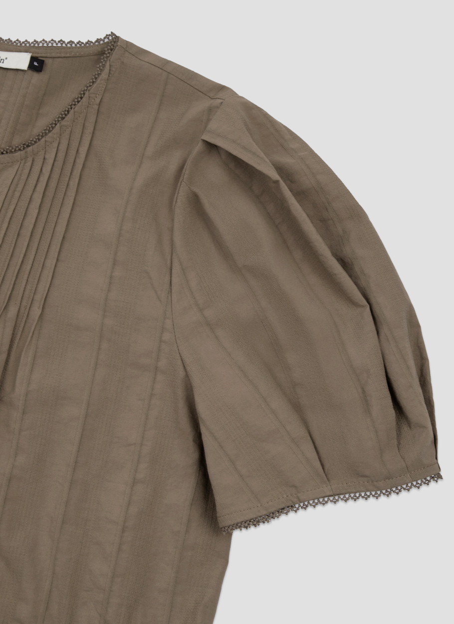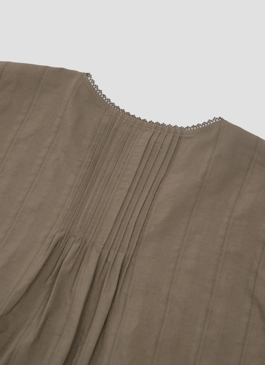핀턱 네크라인과 볼륨 소매로 팔 라인을 살립니다.