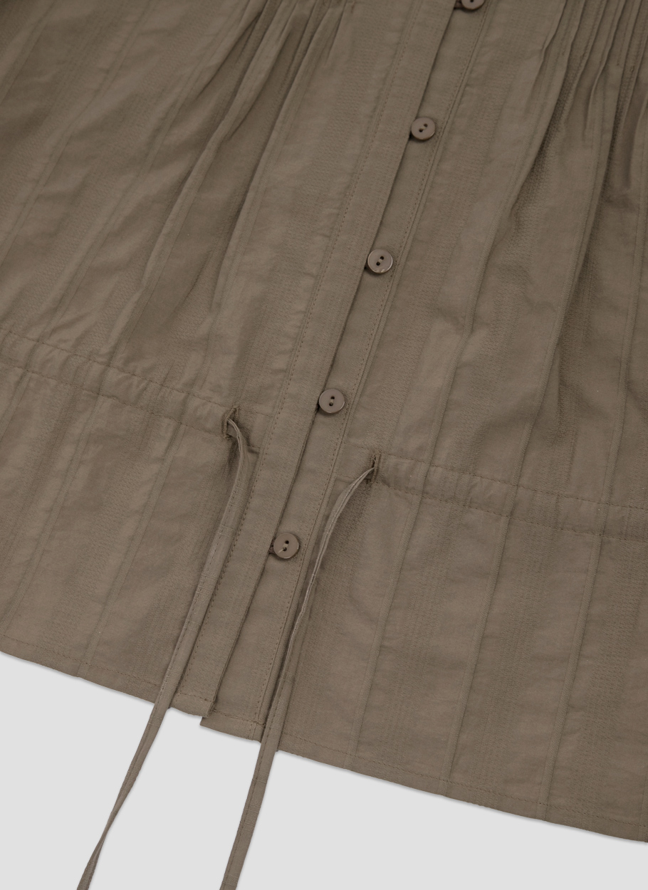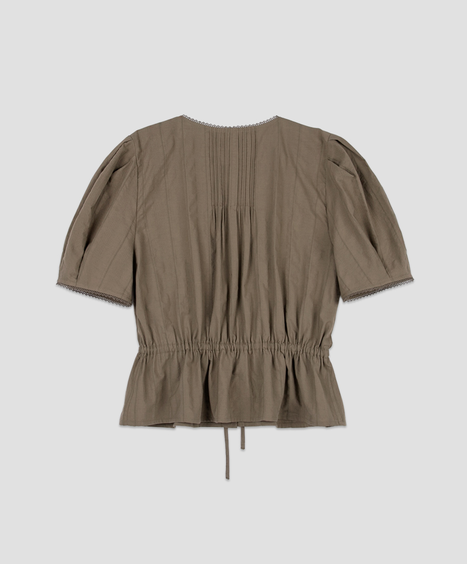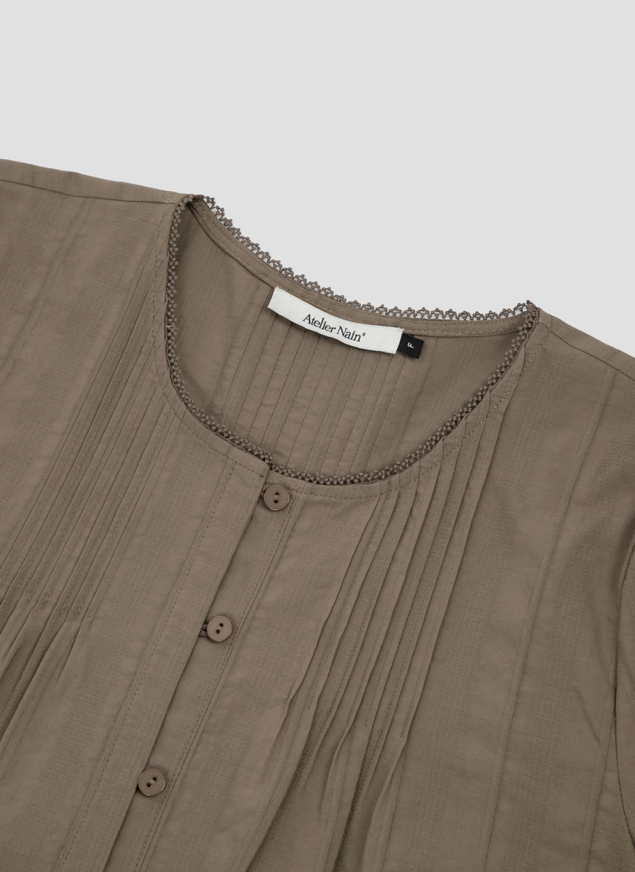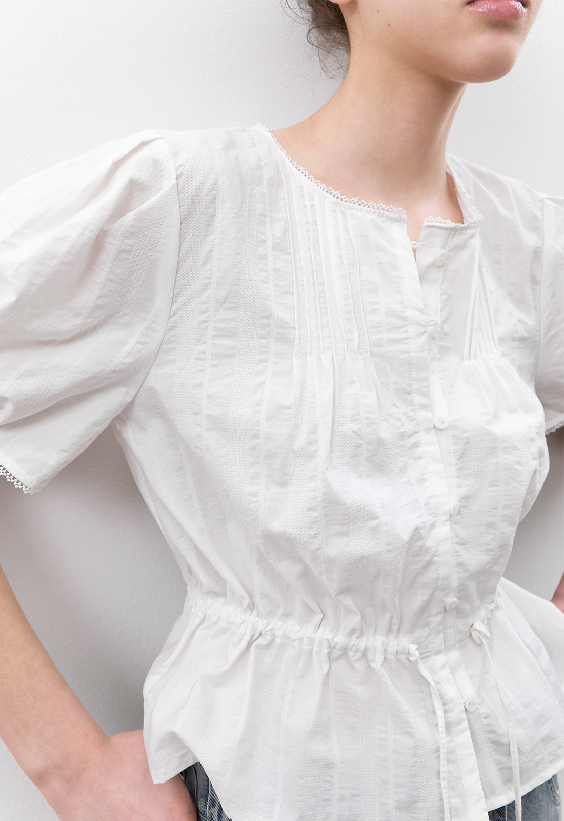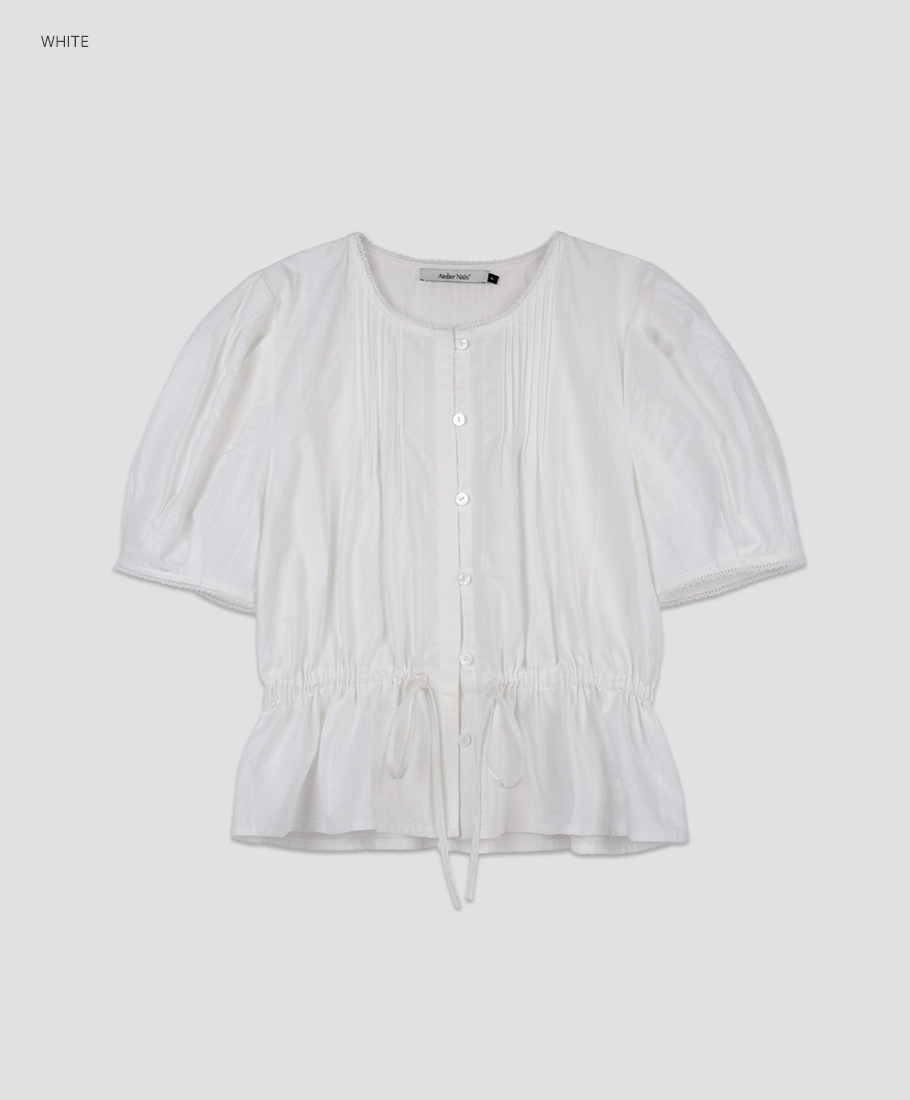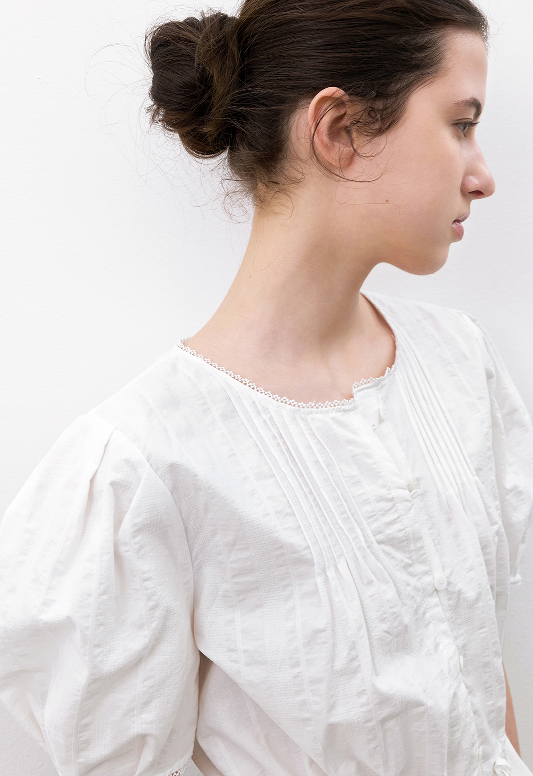 핀턱 네크라인과 볼륨 소매로 팔 라인을 살립니다.