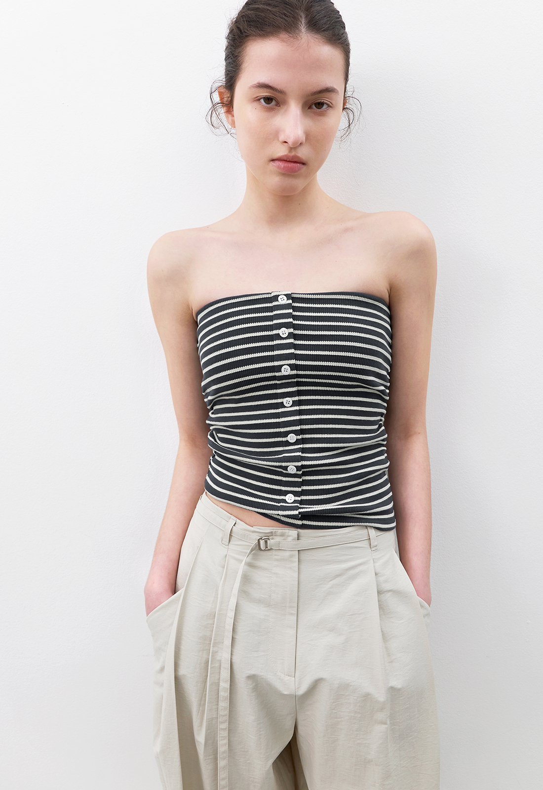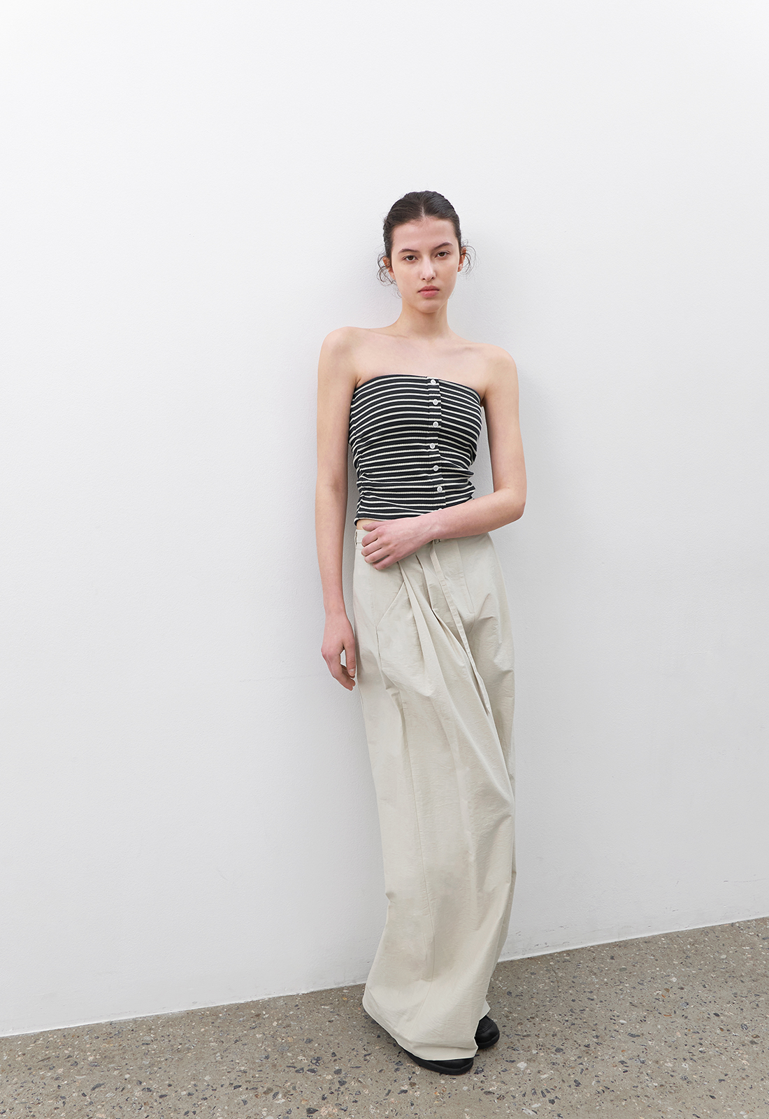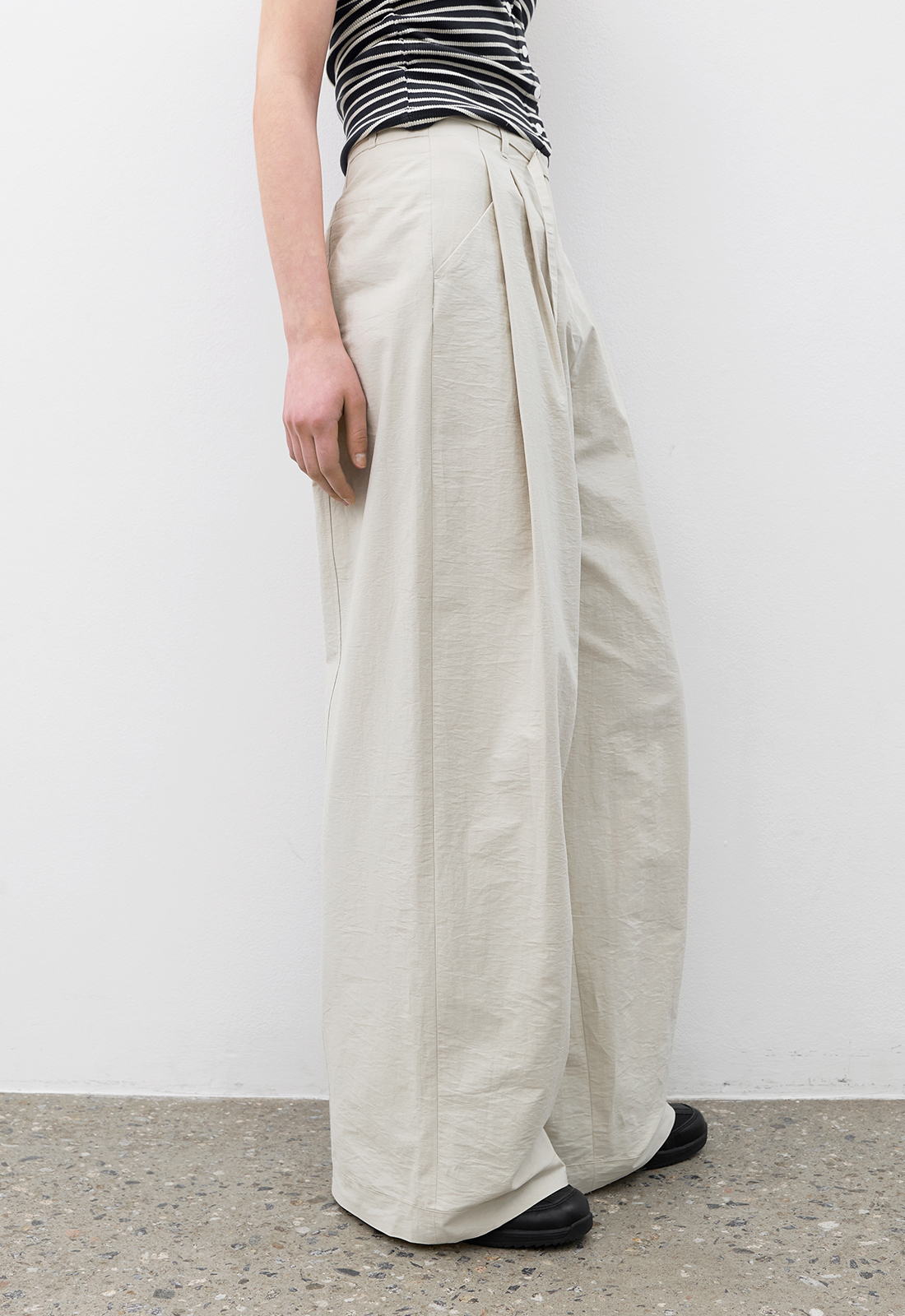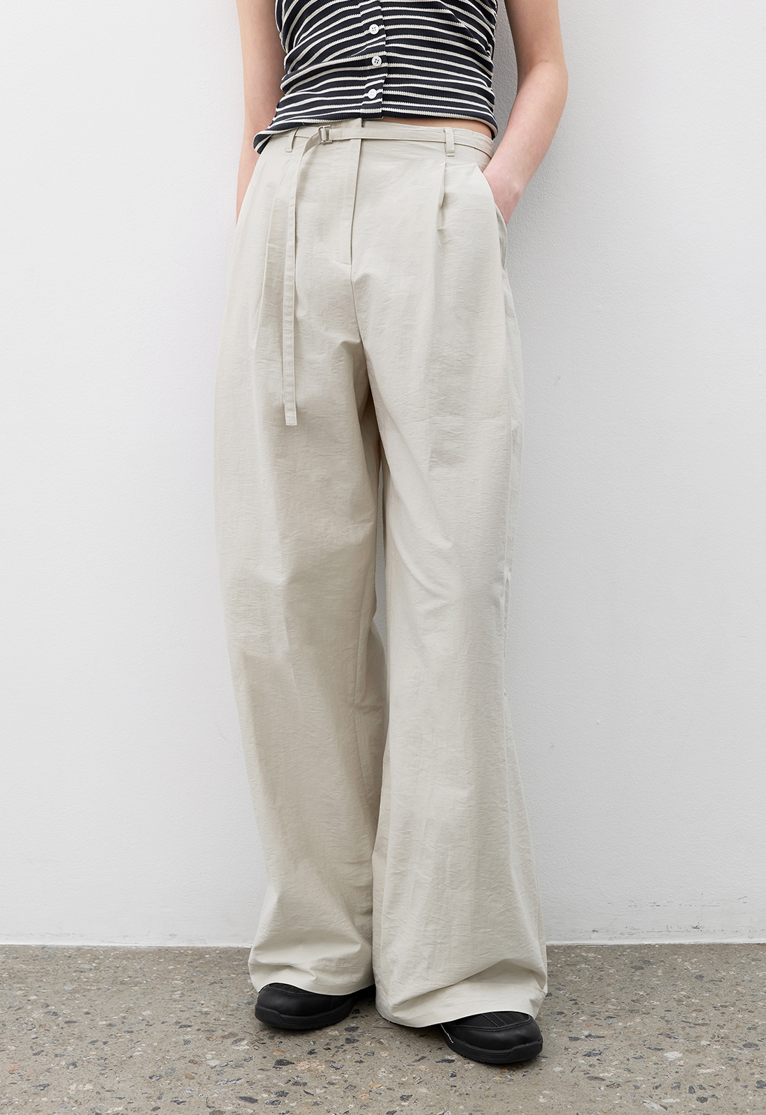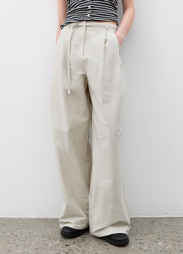 투턱 디테일의 벨트 팬츠로 자연스러운 볼륨과