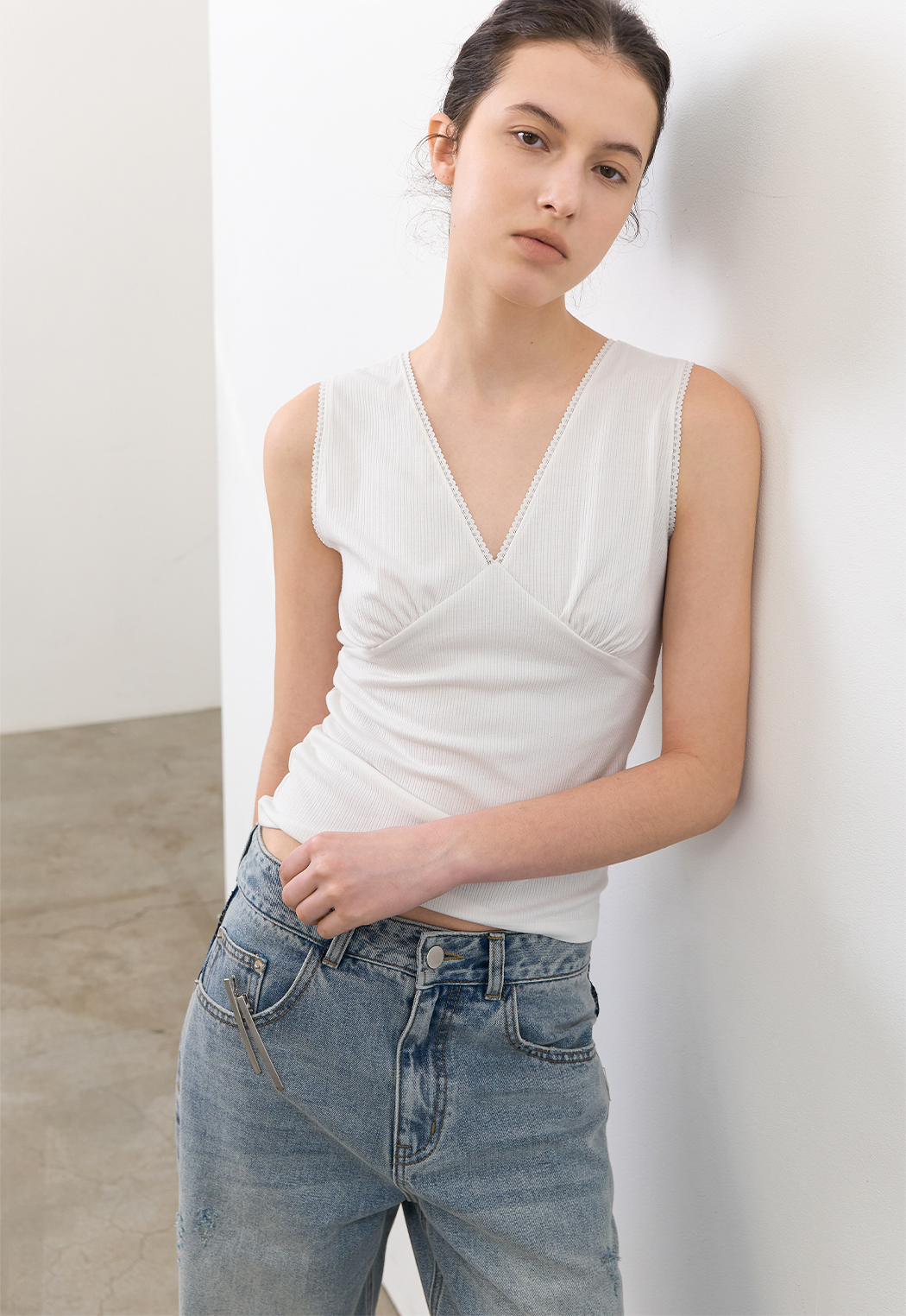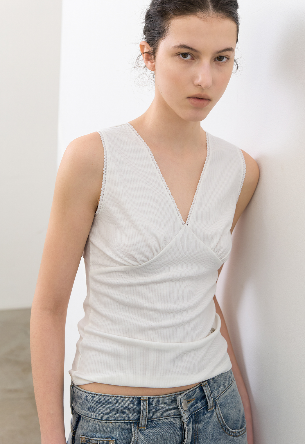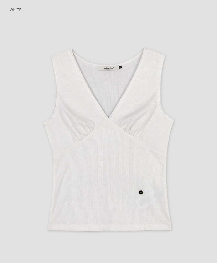 잔잔한 골지 텍스처로 페미닌 무드를 담은 브이넥 슬리브리스 탑입니다.