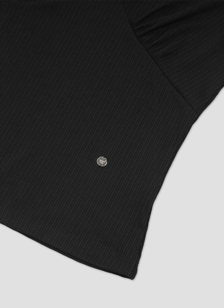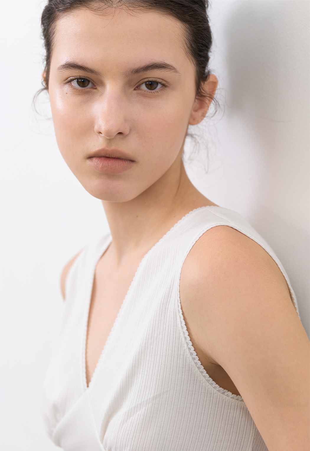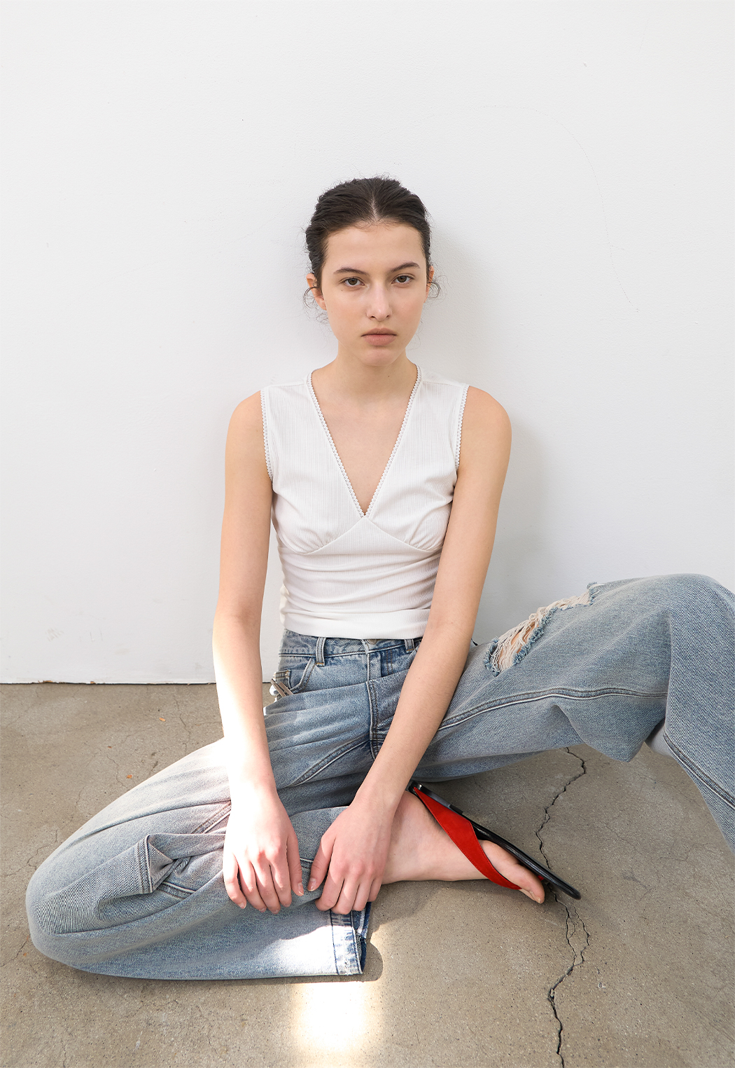 잔잔한 골지 텍스처로 페미닌 무드를 담은 브이넥 슬리브리스 탑입니다.