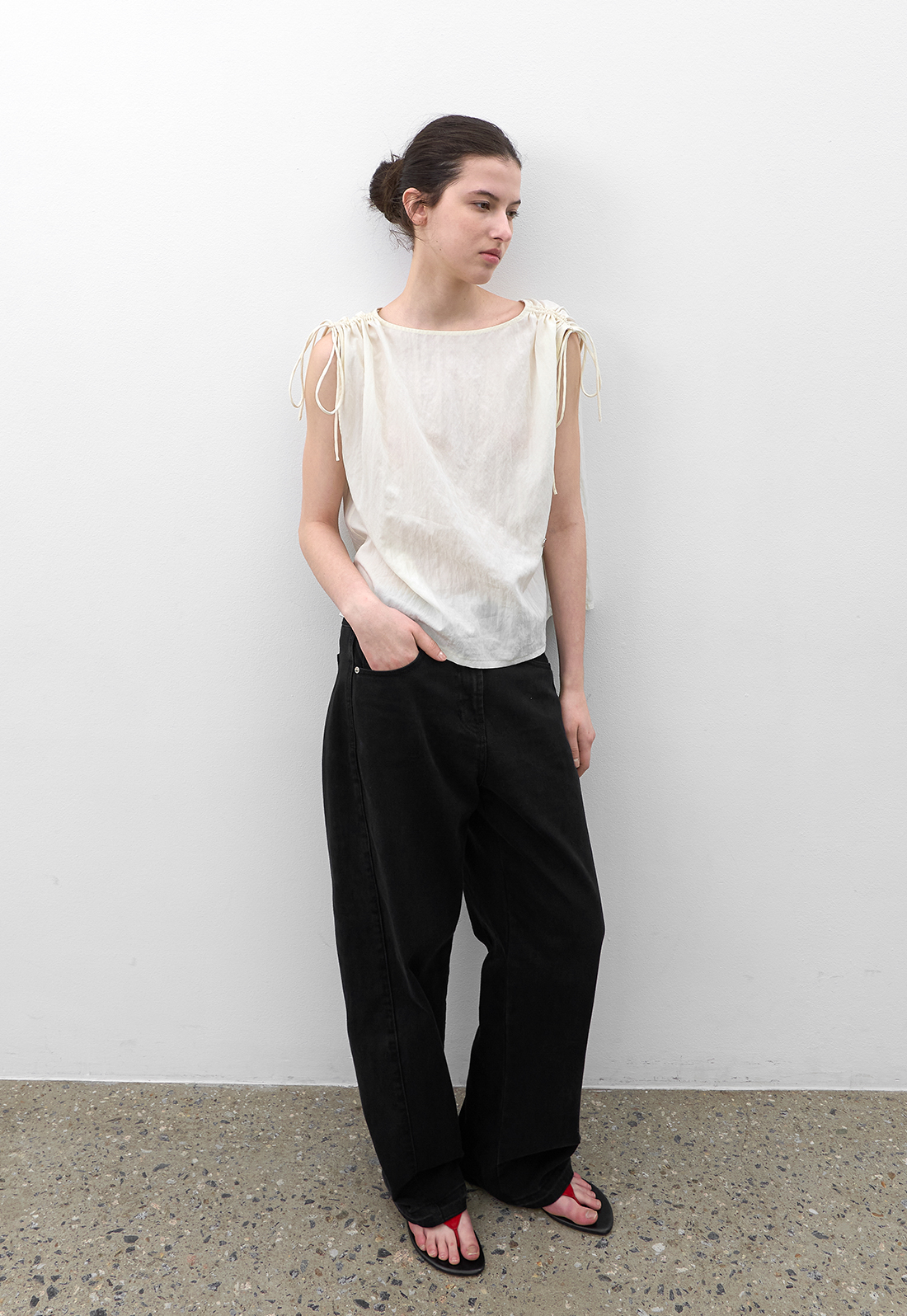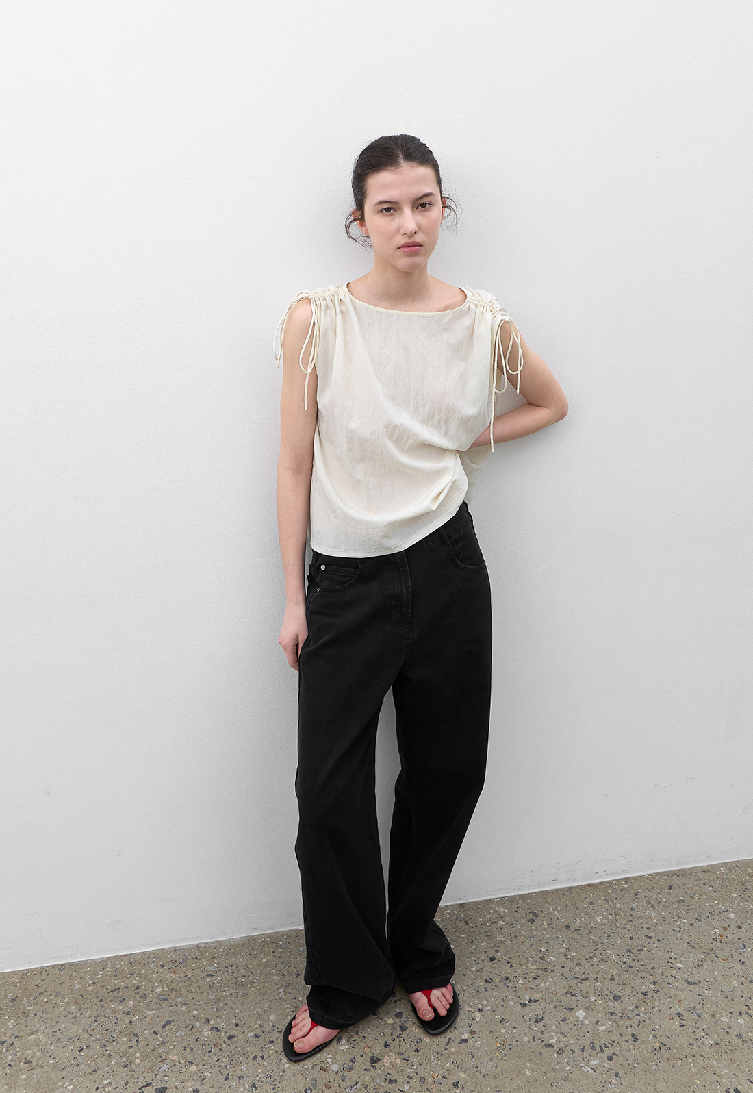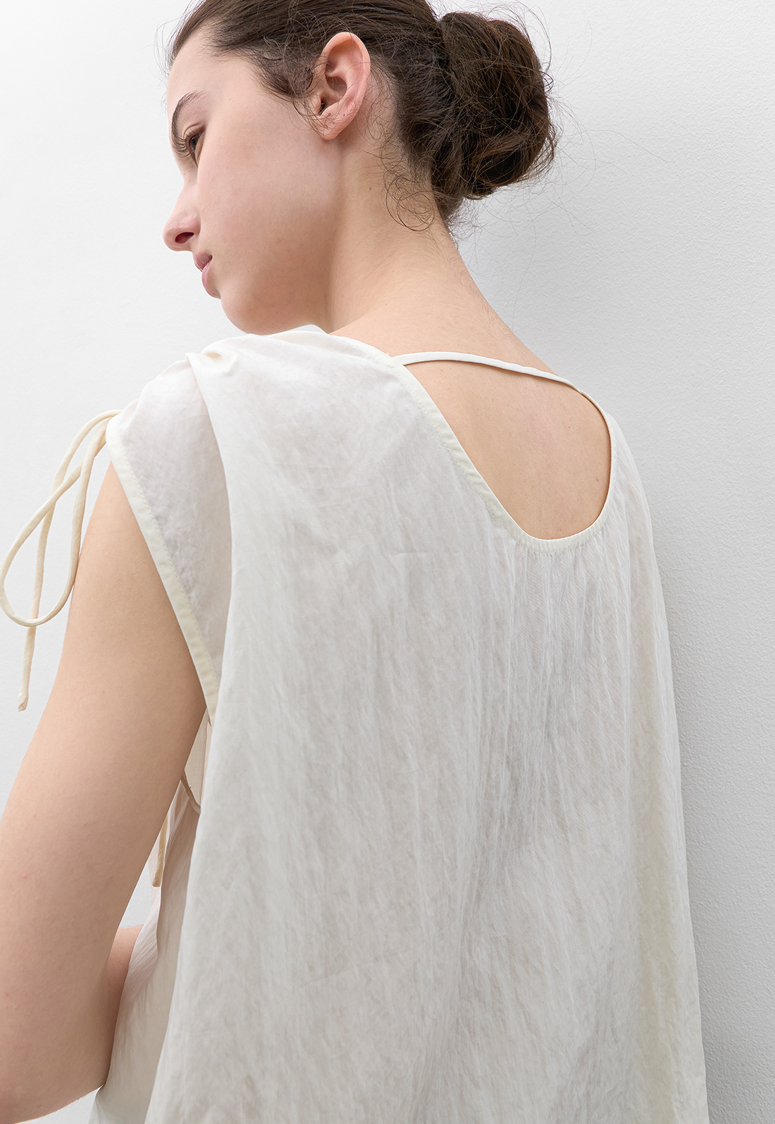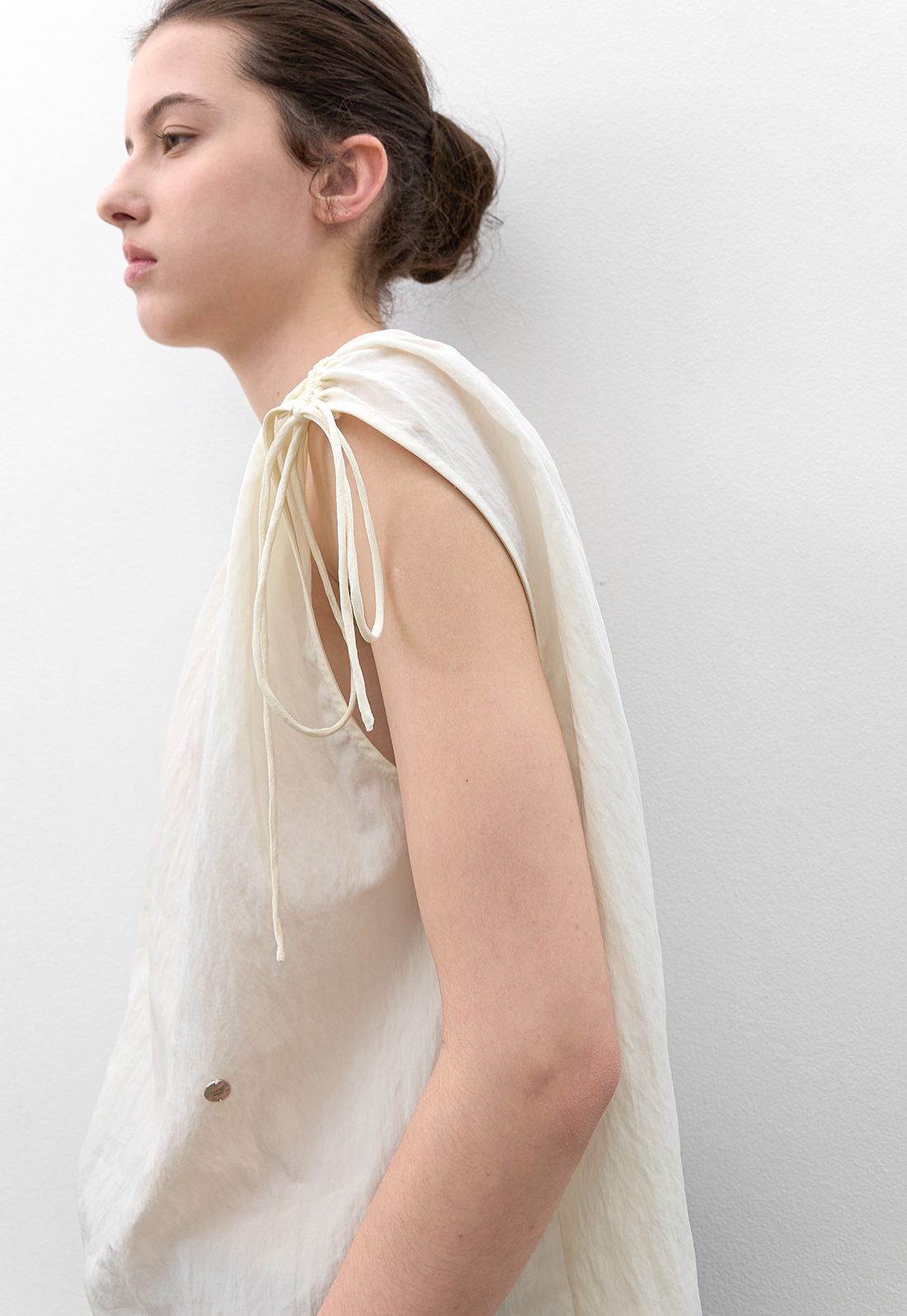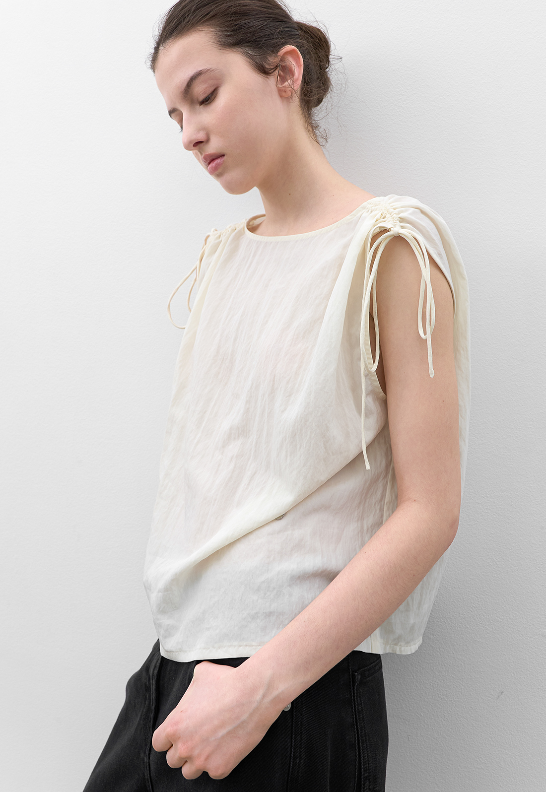 어깨 셔링과 스트링 디테일이 돋보이는 슬리브리스 블라우스입니다.