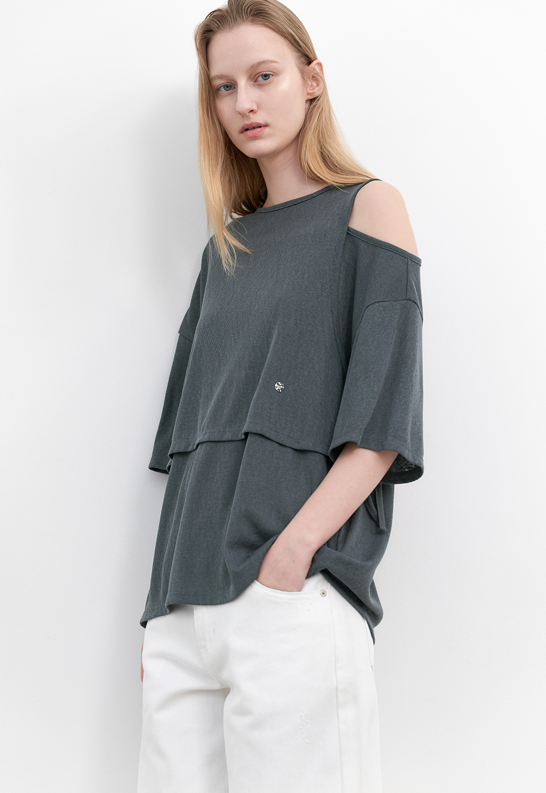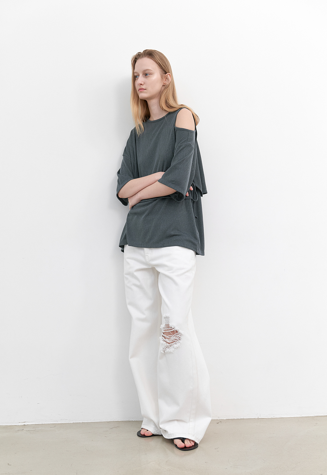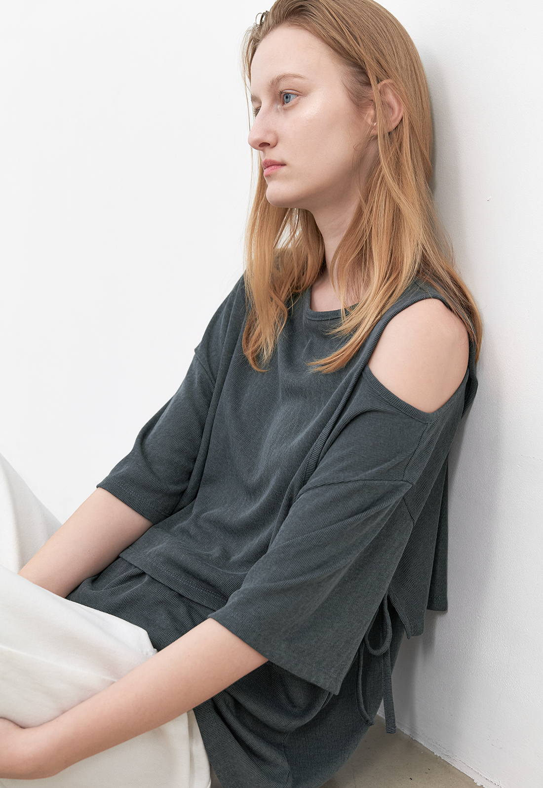과감한 원숄더 컷아웃과 정교한 스트랩 디테일이 만나,