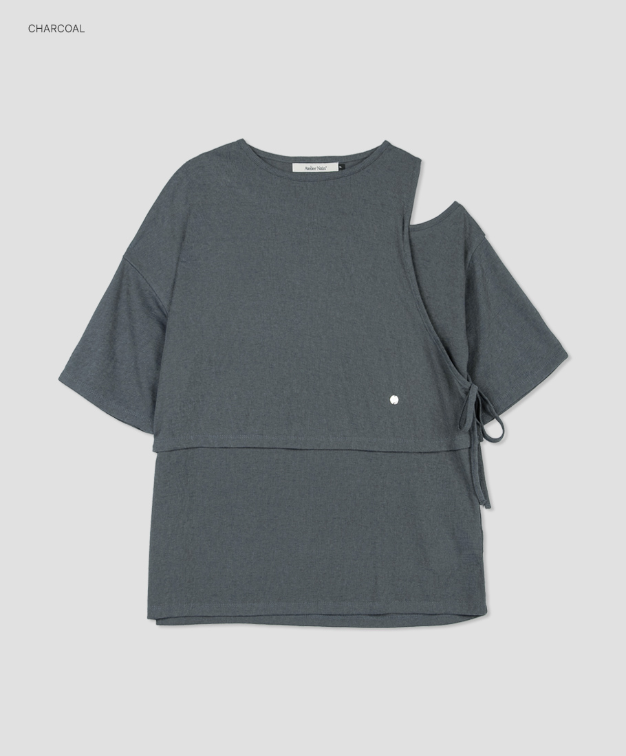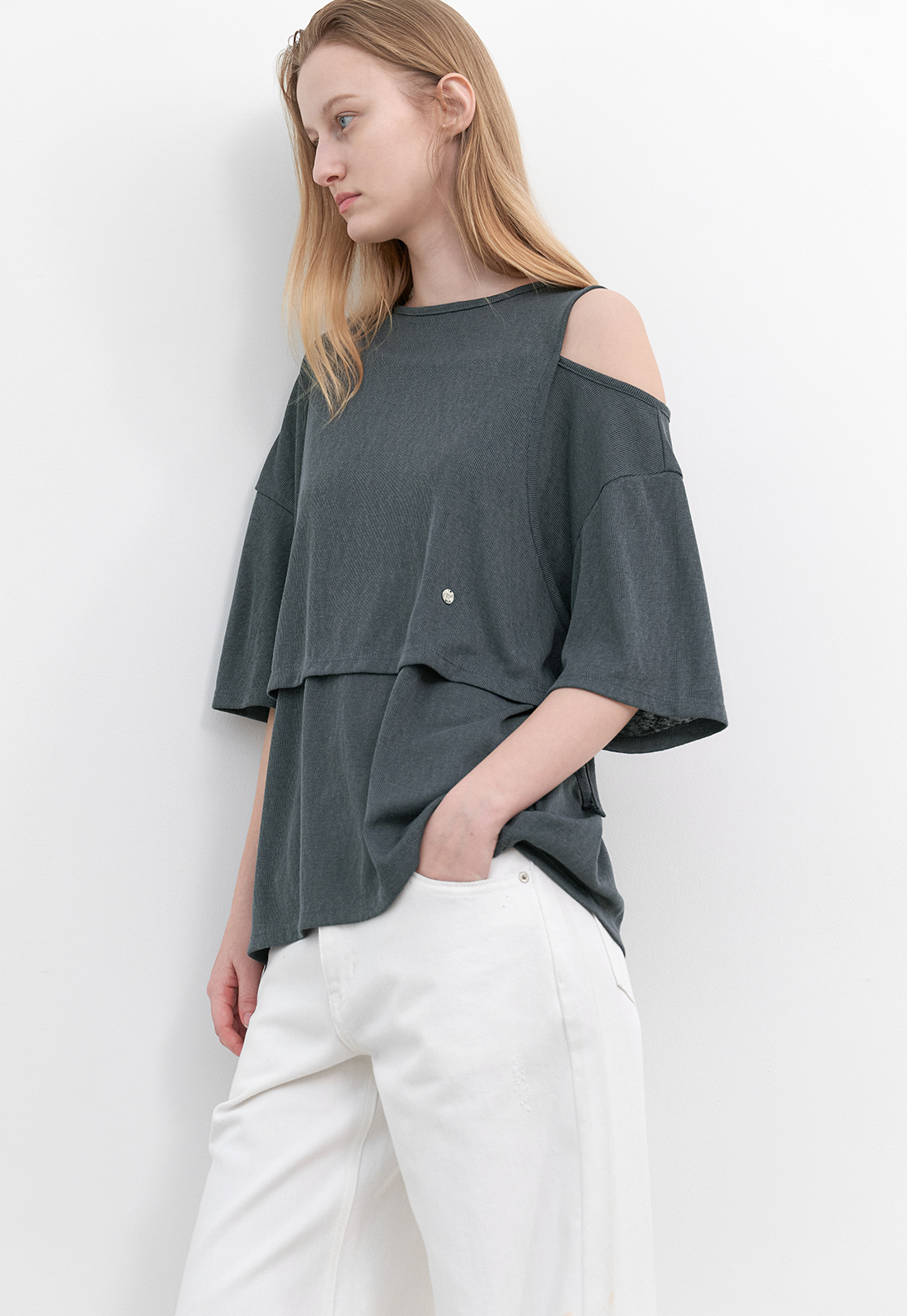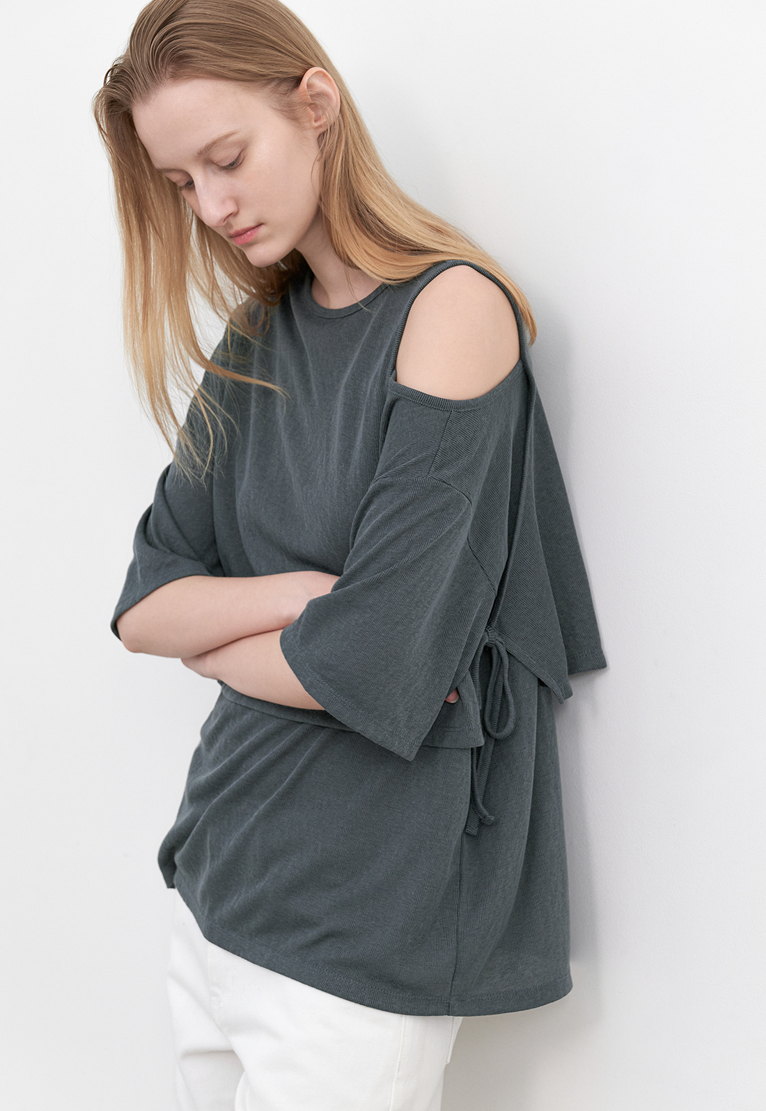 과감한 원숄더 컷아웃과 정교한 스트랩 디테일이 만나,